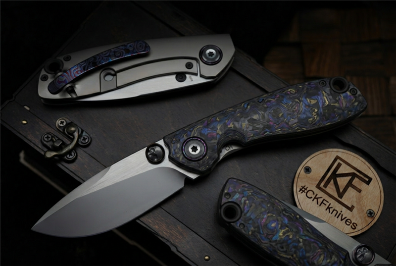 Здесь мы видим карбоновую рукоять с интересным закосом под титановые переливы и клинок с обработкой CKFwash+сатин+зеркало.